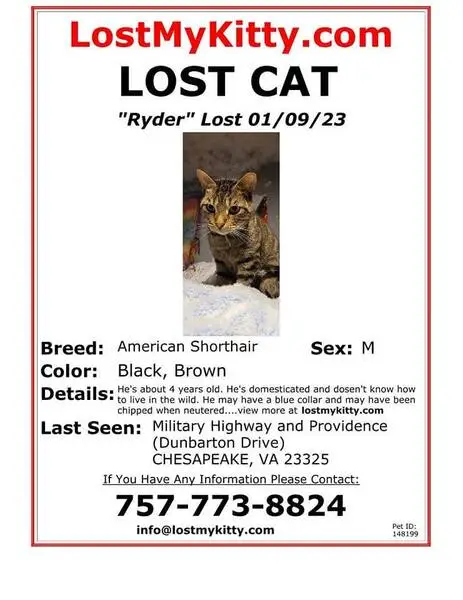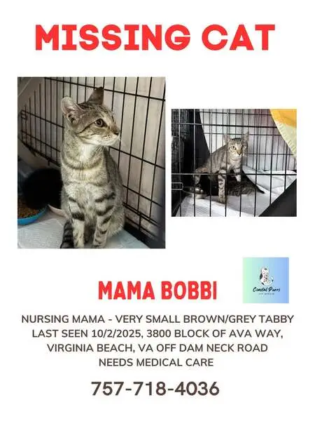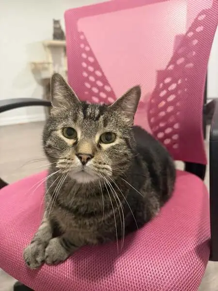 Brown black and grey tabby, not afraid of humans or dogs, ok to be picked up and greets people. Very sweet and friendly