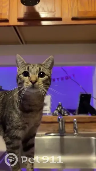 Short hair brown ish with black stripes / dots with green eyes he has no collar on he likes to take it off and hide it.