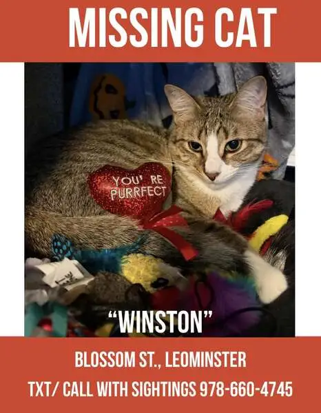 She has been here 10 years she comes in and out she has a heated house out on the porch her home bed basket her food her water and she comes in the house and sleeps on the couch or the bed she never roams she goes across the street in the drain and back and on my neighbor's porch right next door everybody here knows her they've all told me they haven't seen her since the snow she's gray she stripes she has the white underneath chest for white socks pretty colors in her face sort of rust