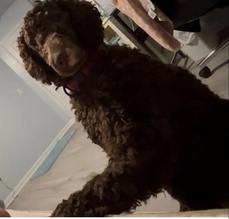 Copper color fur, he seemed to be really dehydrated and lethargic but once he got water he was happy. His collar was a light green/gray color.