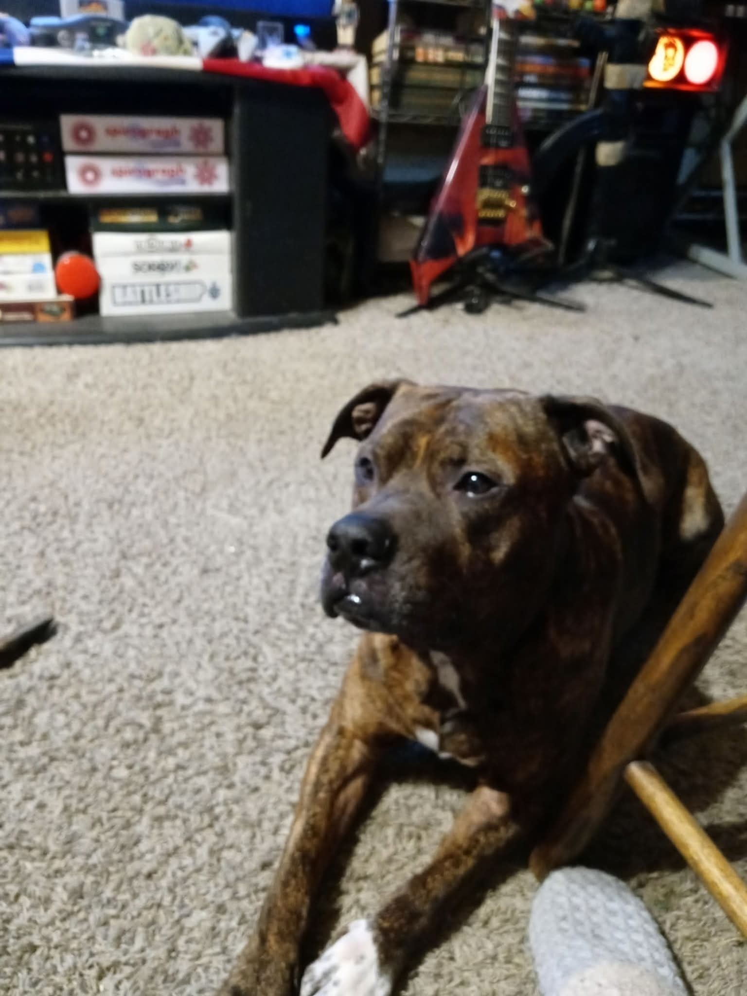 He has a brindle coat and he's kinda small but not too small and he has white on his chest and paws and his tail is kinda curled up. Hes not aggressive and will approach if you have human food.