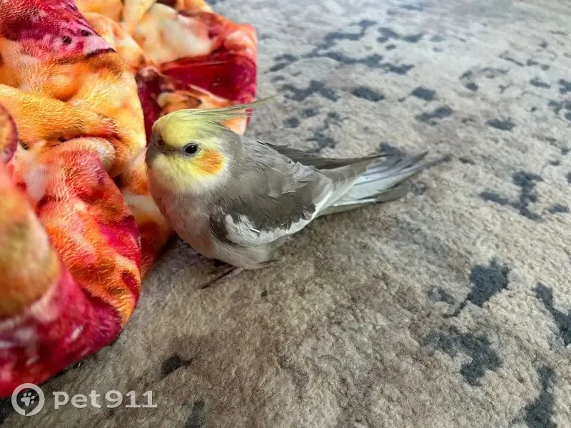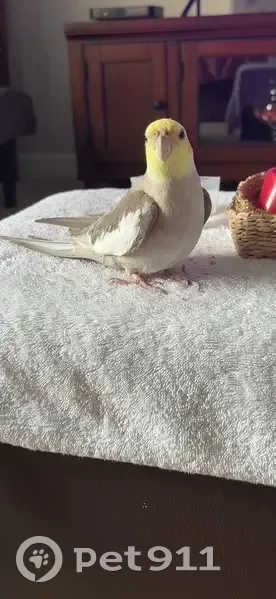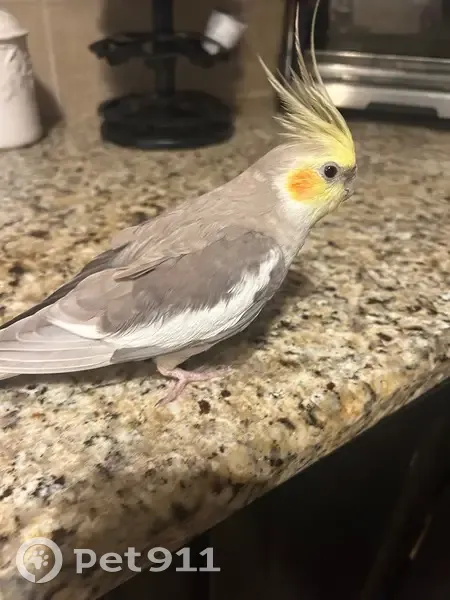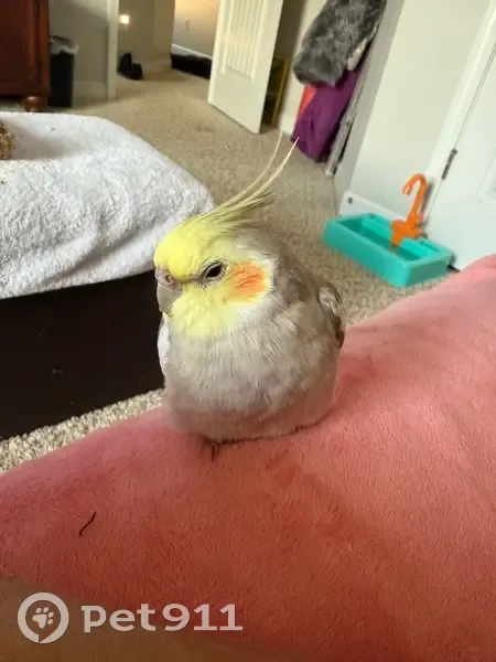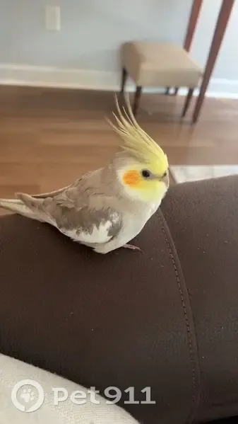 Last seen: Near Johnsons Landing/Angier Small cockatiel with [gray body, yellow face, orange cheeks]. Very friendly / may whistle / may respond with “Come here” Loves people and may fly to shoulders or respond to Mimi