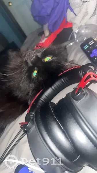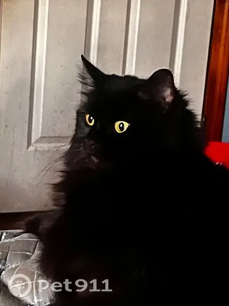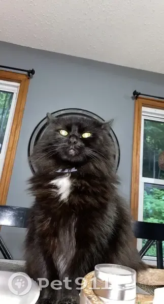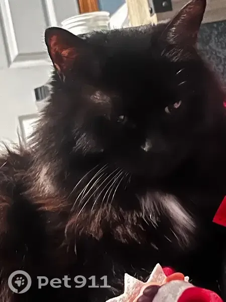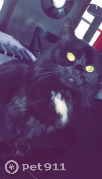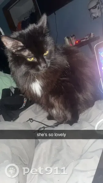 Black fluffy cat, White patch of fur on her chest. Very startled and very easily scared. She ran away out of fear, very sensitive to loud noises so she will freak out with loud sounds. Please call me at 4752289220 if spotted or seen.