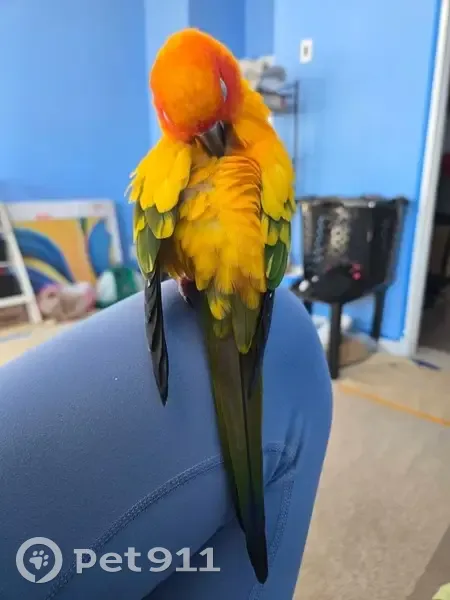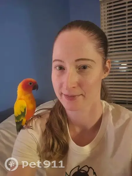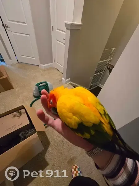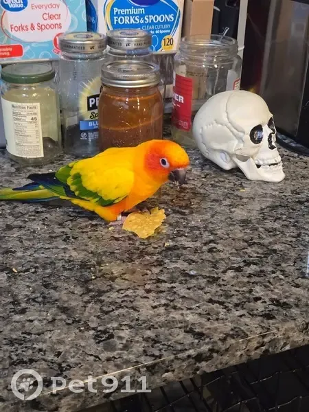 Adult Sun Conure "Donny" with yellow down the back of his wings. He is not clipped and has full flight feathers that are blue at the tips. He responds to his name, usually, by screaming back at you. He can be lured with apples or Cheez Its. He also loves corn chips. He is a very good flyer, so please contact me immediately if you see him and do not attempt to catch him unless you have a very good chance of doing so. Last seen flying S/SE over Boxcar Way but was also spotted in the complete opposite direction right after he got out by 1 neighbor.