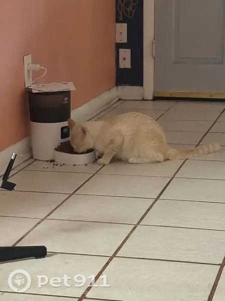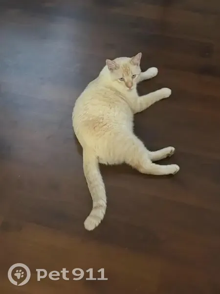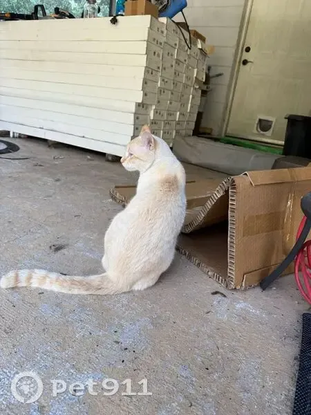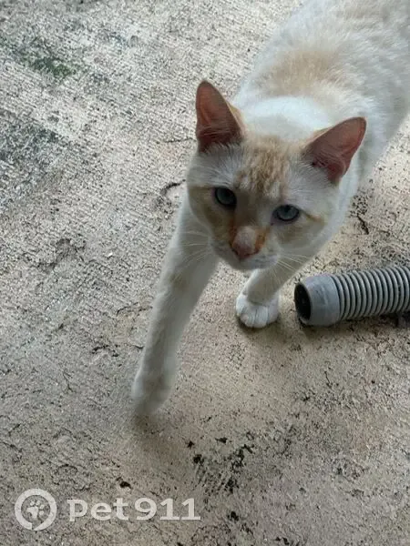 He's a very curious fellow and got out through a hole in our screen. He has a white coat dusted with orange, blue eyes, and a pink nose and beans, with orange on his ears and orange rings on his tail. He's very friendly and cuddly, and loves kisses and playing fetch.