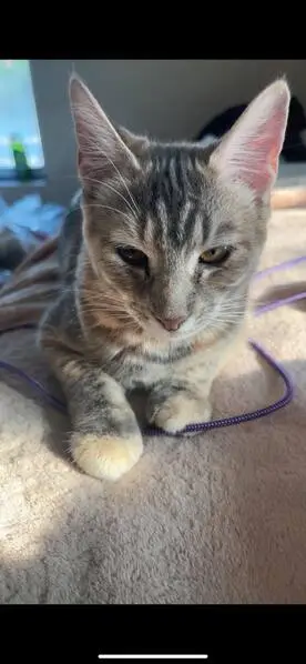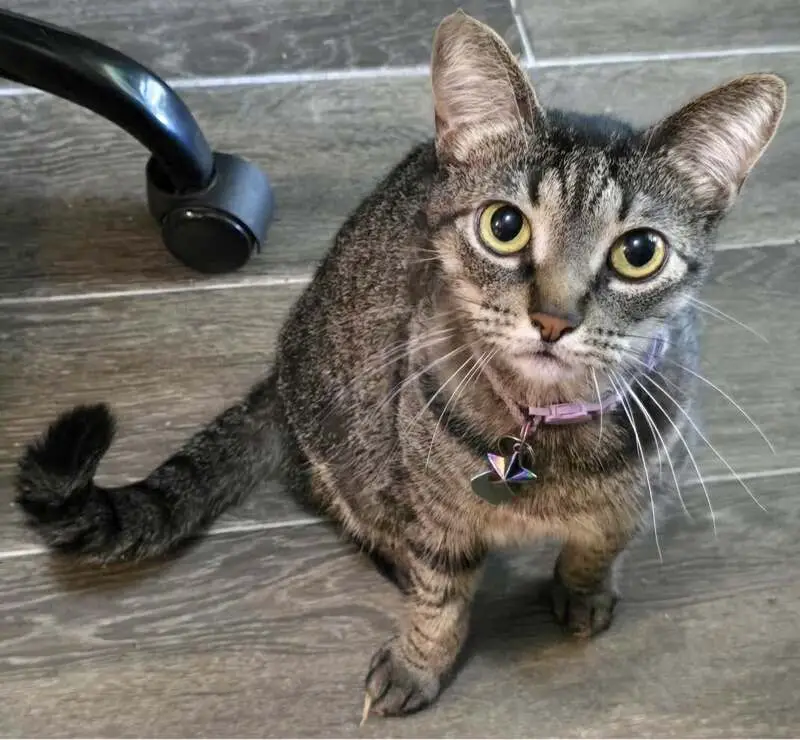 Almond shaped eyes, spotted belly with light colors High backend M on forehead Striped legs in front and around neck Mouth and chin white