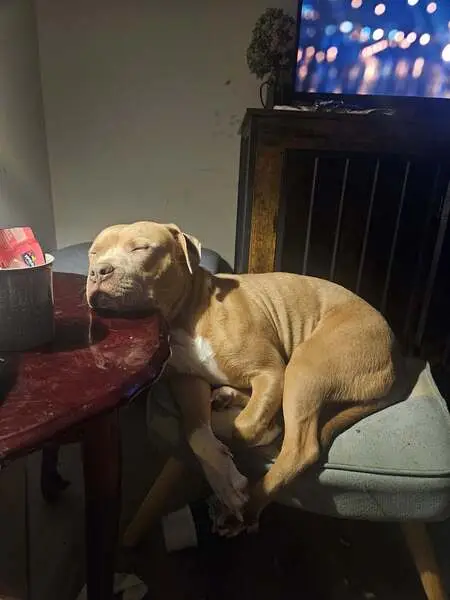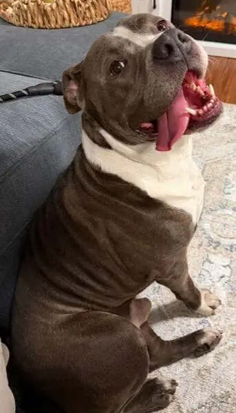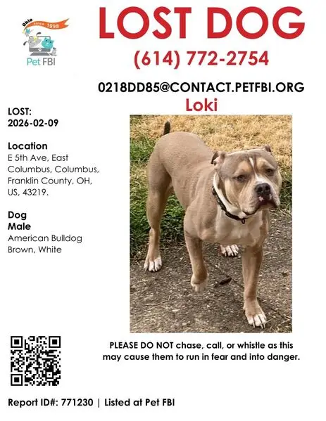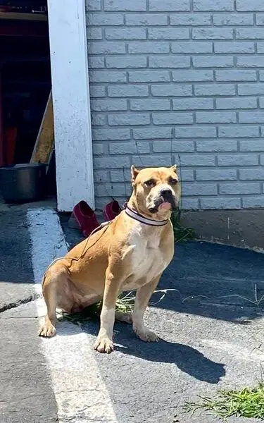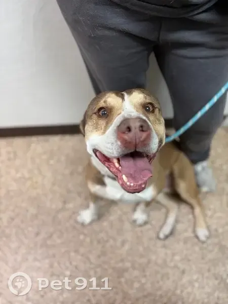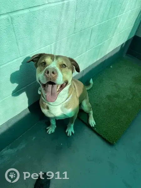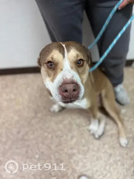 Medium-to-large male dog with a short tan/brown coat and white markings on his face, chest, and paws. He has a distinct white stripe down his nose and a “curled or was broken” tail. Very friendly and curious, follows people around and enjoys attention. He was found wearing a collar but had no tags, and he does not have a microchip. Brought him in for safety.