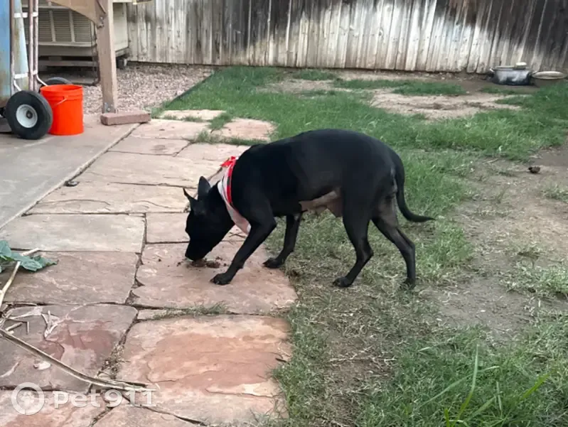 Black with a shaved belly. She was just adopted 12-8-25 so does not know her name. Did not even have a collar yet. She is chipped. Chewed through the fence today, time unknown, and disappeared. She was wearing a red and white bandana.