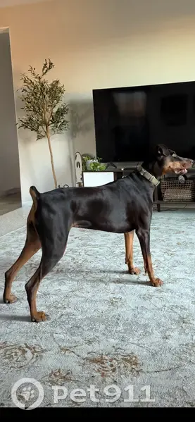 She’s a chocolate Doberman with caramel spots . She has a Carmel eyes . There’s a small scar on the right side of her face , and has a small patch of white hair on her forehead on top of her head . We were grilling meat so the kids were out on their bikes in front of the house. She kept barking so I decided I would take her for a walk. Well I grabbed her by the collar to connect the leash, but she twisted in a way where if she pulled anymore towards the left my wrist would snap. So I tried pushing her clockwise to fix my wrist and get a better grip but she pulled as I moved my hand and I lost grip to the collar .