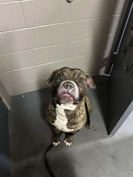 Looks like a pit mix. Brindle. Appears to be recently spade. Found in Gateway Plaza parking lot off of I-30. Update ….LR Animal Village will pick the dog up this afternoon.