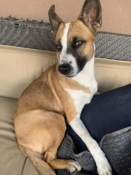 White and orange dog has orange freckles on her medium size I would say 60 pounds with a curly tail