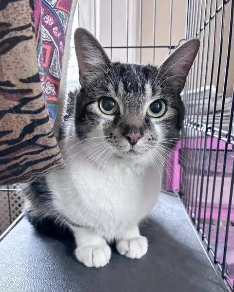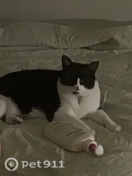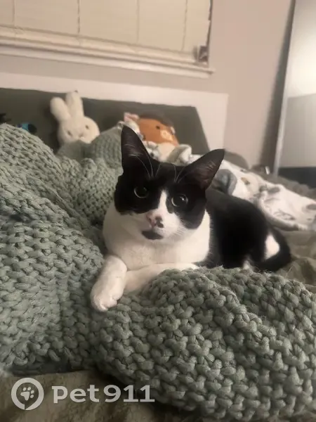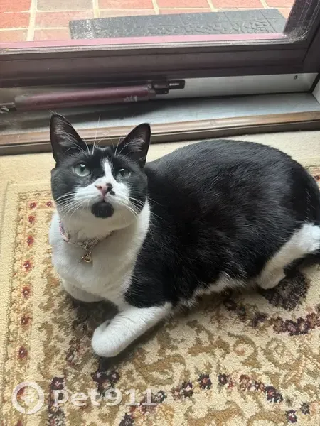 Yuno is a 3 year old tuxedo cat. She has black spots on her nose with green eyes. She does not have a collar on but is microchipped. We believe she escaped through our backdoor and became skiddish and possibly hiding. It is very unlike her to run away.