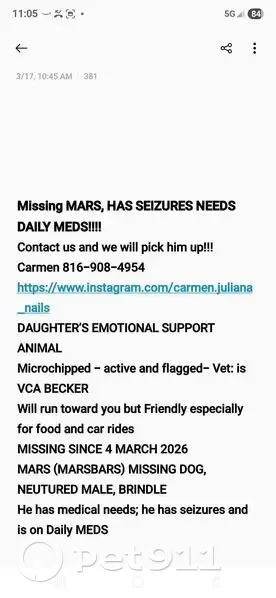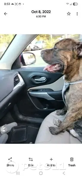 7 year old NEUTURED MALE, BRINDLE, he has medical needs; he has seizures and is on Daily MEDS. He is knee high, 20" tall, 75-80lbs, stocky build. Loves car rides, friendly and will run towards people