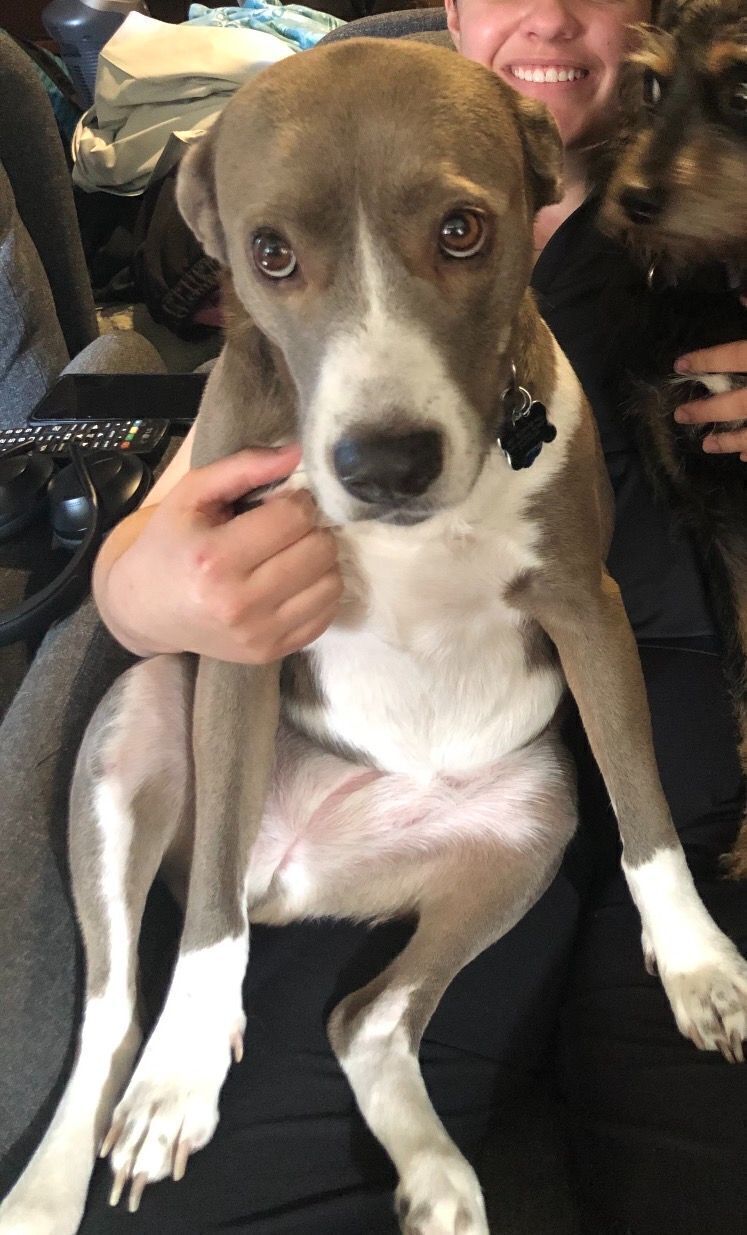 Bownish/gray. She has white around her nose and her belly and paws are white.Has on brown or gray collar. Very sweet. Went missing near the Cloister Apartments in Arlington, TX 76011