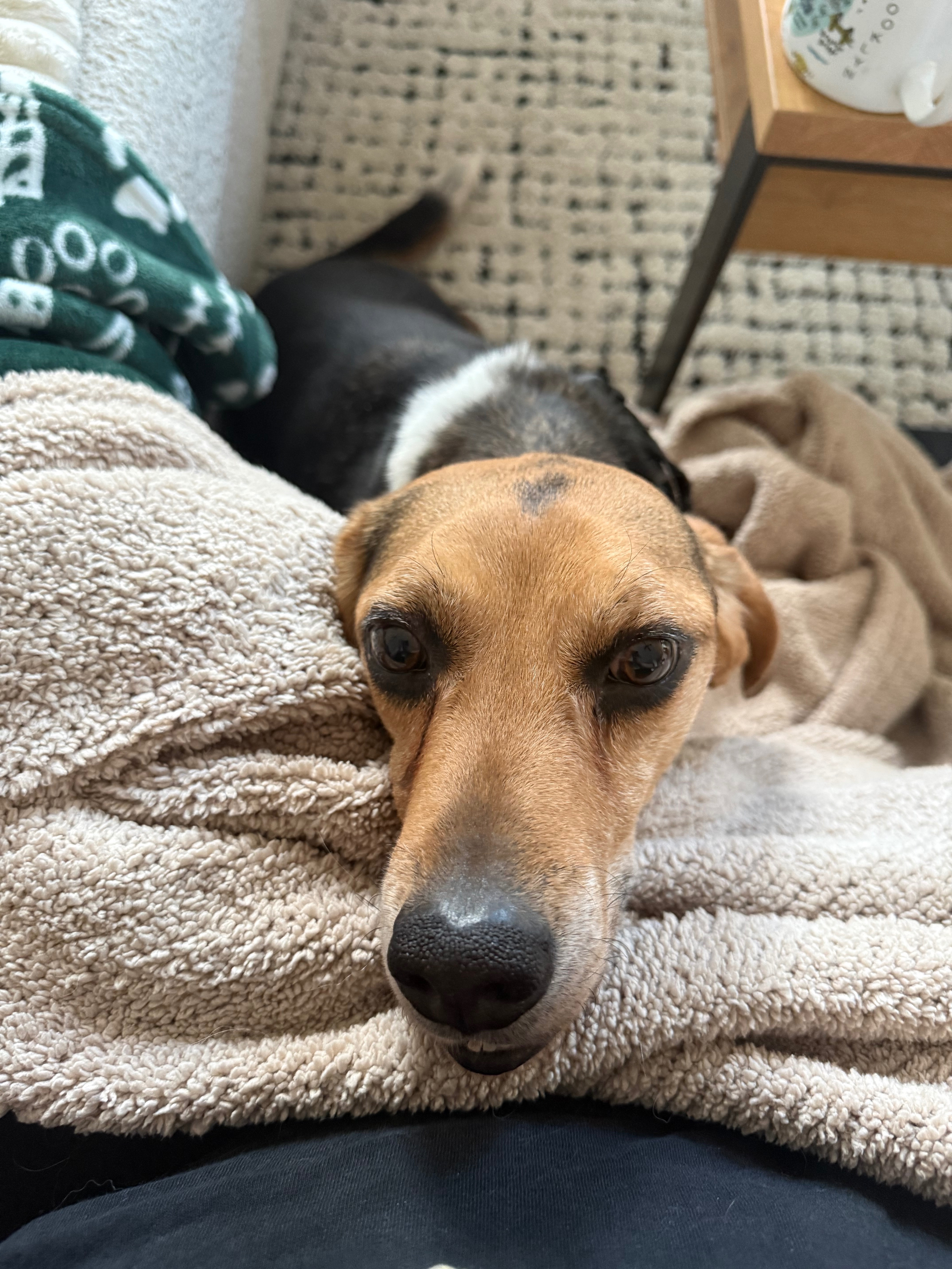 We found a beautiful beagle boy on our deck last night around 8pm. We opened the door to let our own dogs out and before we could walk outside, he came running in. He has tear marks under both his eyes but one is more prominent on the right side than the other.