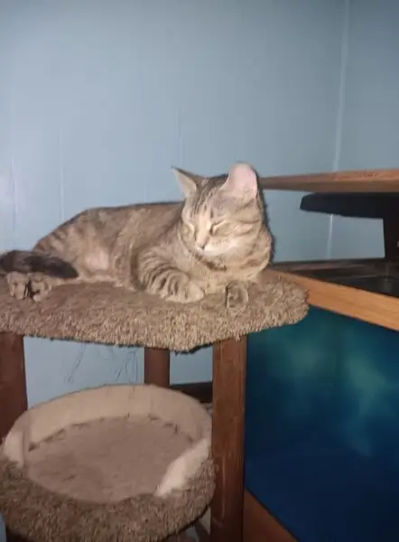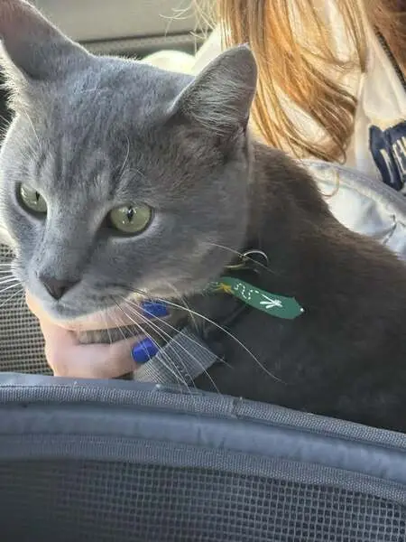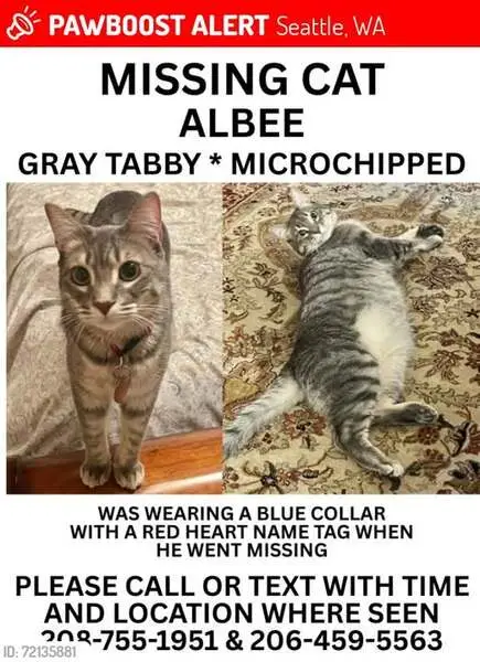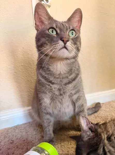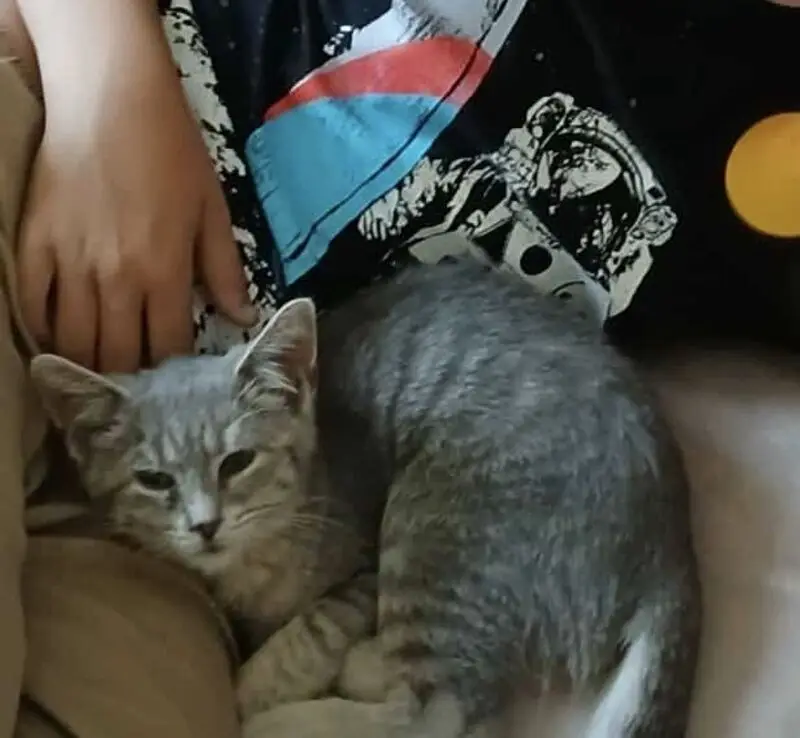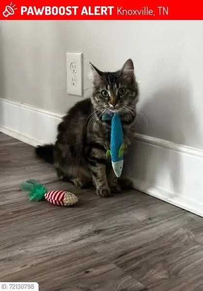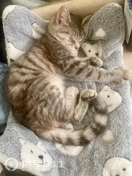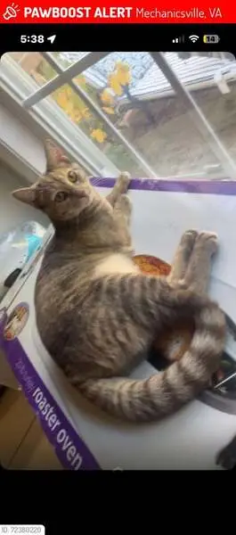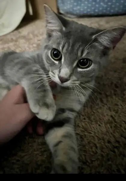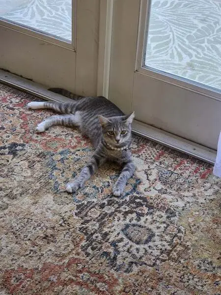 Tiny gray tabby girl. Incredibly sweet and cuddly. Chatty, too! She must belong to someone. She is safe in our house but we want to get her back to hers, if it exists!