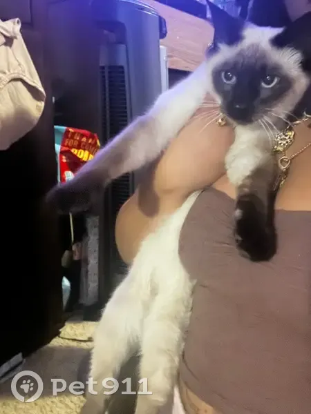Siamese cat that’s about 8 months old She can be kinda skittish and gets scared easily but is very sweet and likes being pet once she’s calm. She got out of her harness and ran away.
