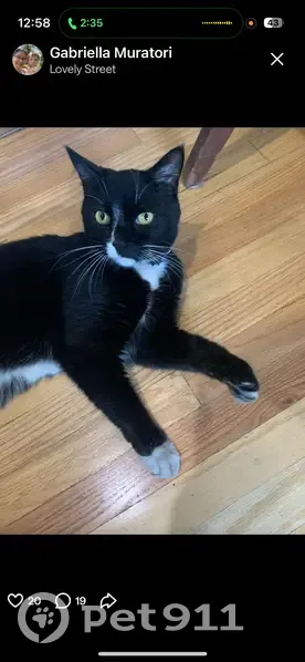 Black and white tuxedo cat. White paws and belly. Very friendly. He will respond to his name or a whistle. Sadly no collar on him. He lost it over the weekend.