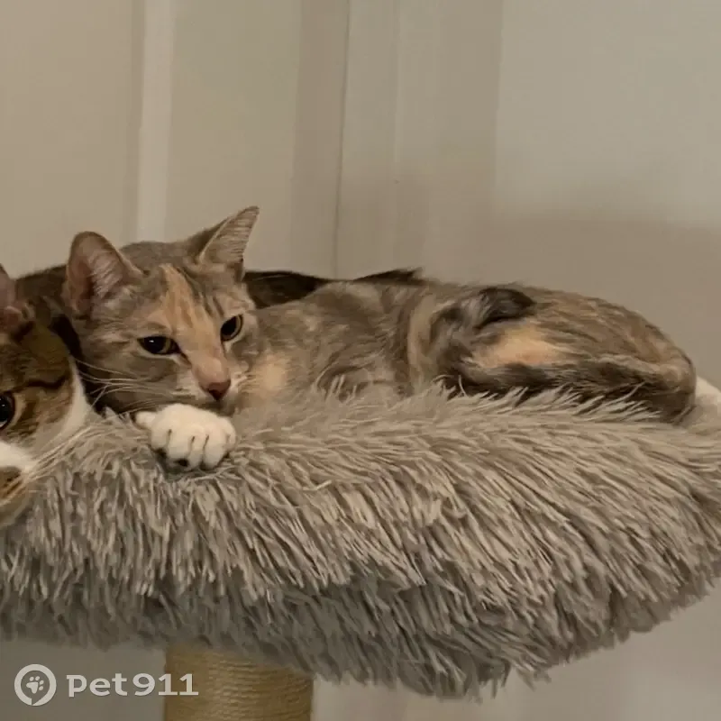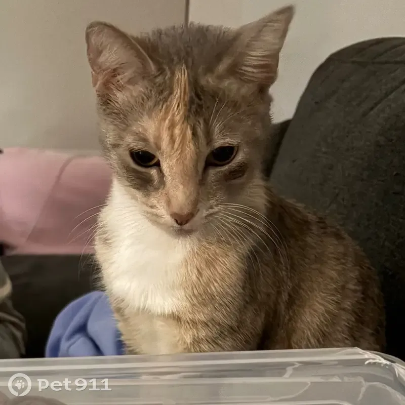 Delilah ran out of our garage door, has never been out before. She is a miniature cat 1.5 yrs old. Gray with orange spots around her body and an orange mark above her nose.