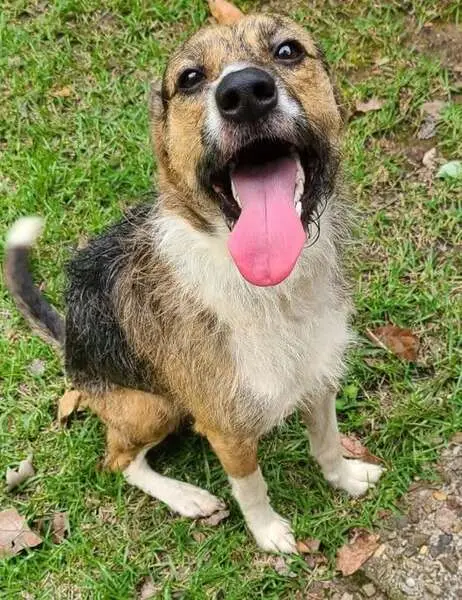 Ski is tan and white w a red service vest on she was spooked around 9am this morning so she will have a rope chain w the hitch dragging behind. I have people who have seen her around 1pm at the pier by Noah's Ark. Please call me w any information 713-204-7539.