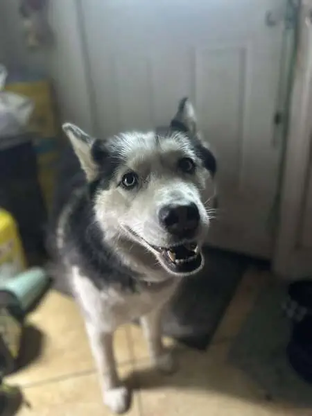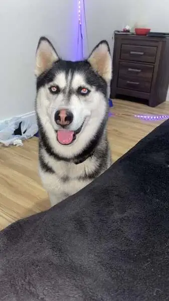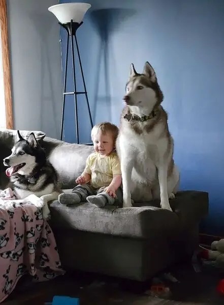 Two huskies, one male white and gray color, blue eyes with black collar the other one female white hair blue eyes with green olive collar, both very friendly and listen to commands
