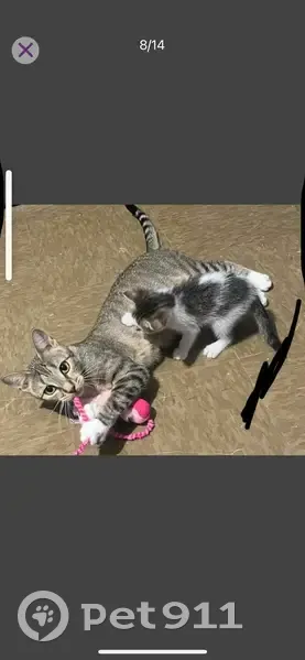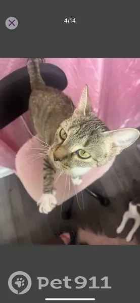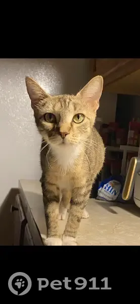 Minnie is a inside cat she never been out she is 3 years old very tiny compared to other cats domestic short hair light brown tabby stripes on her tail/legs and white front and back paws with a little brown on her left front paw white on her chest and beautiful yellowish eyes