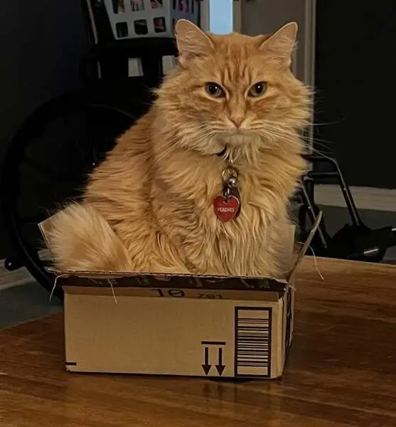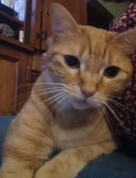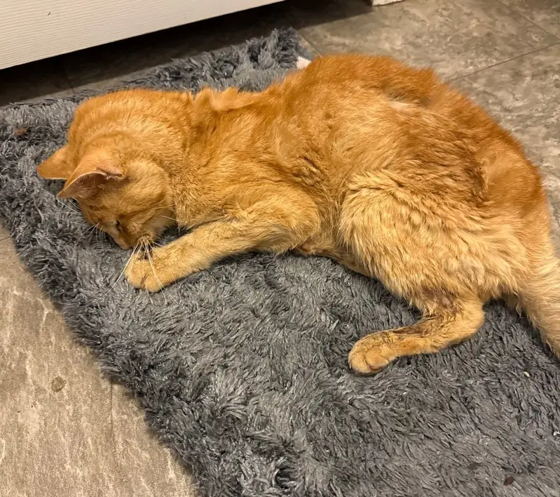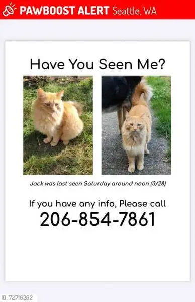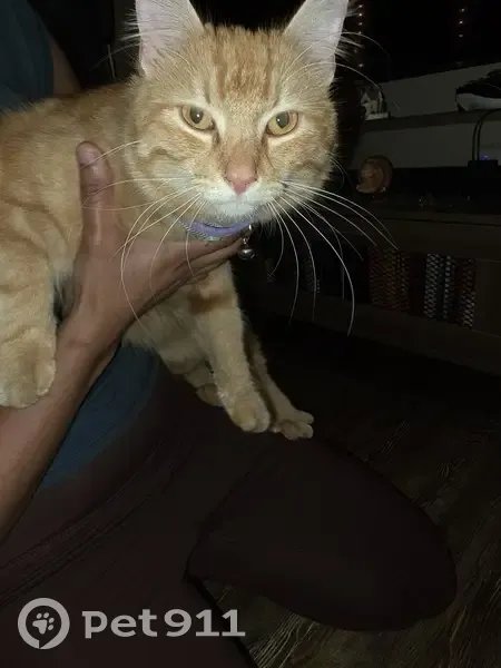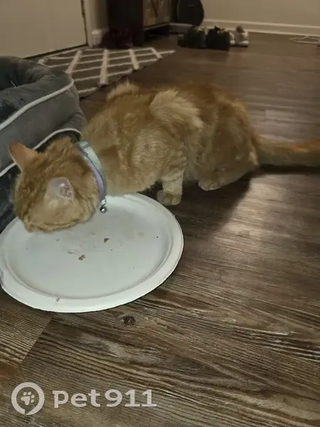 Orange cat, 2 collars - green and purple with bell, quite friendly, found him eating cat food put for feral cats in our porch
