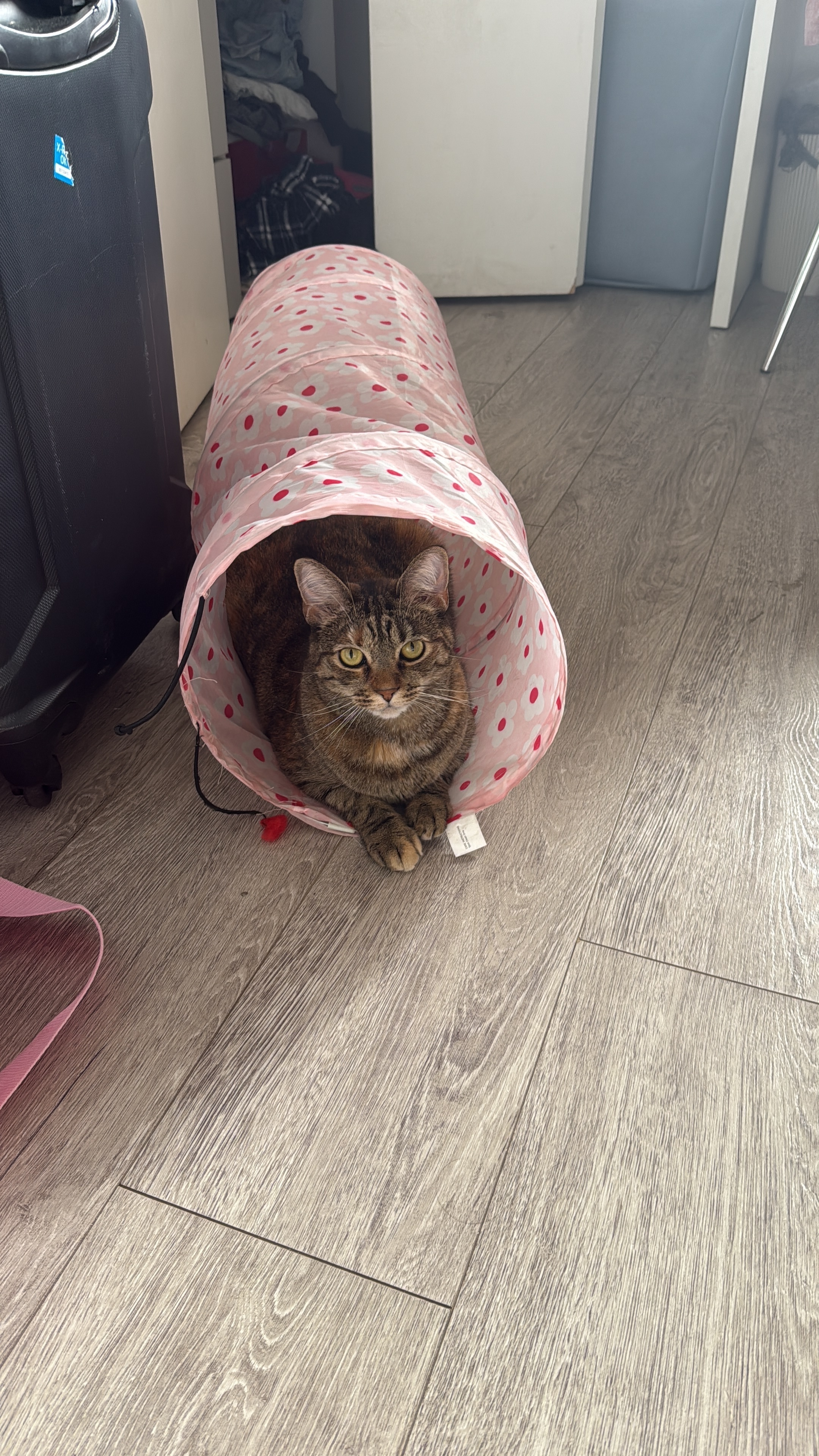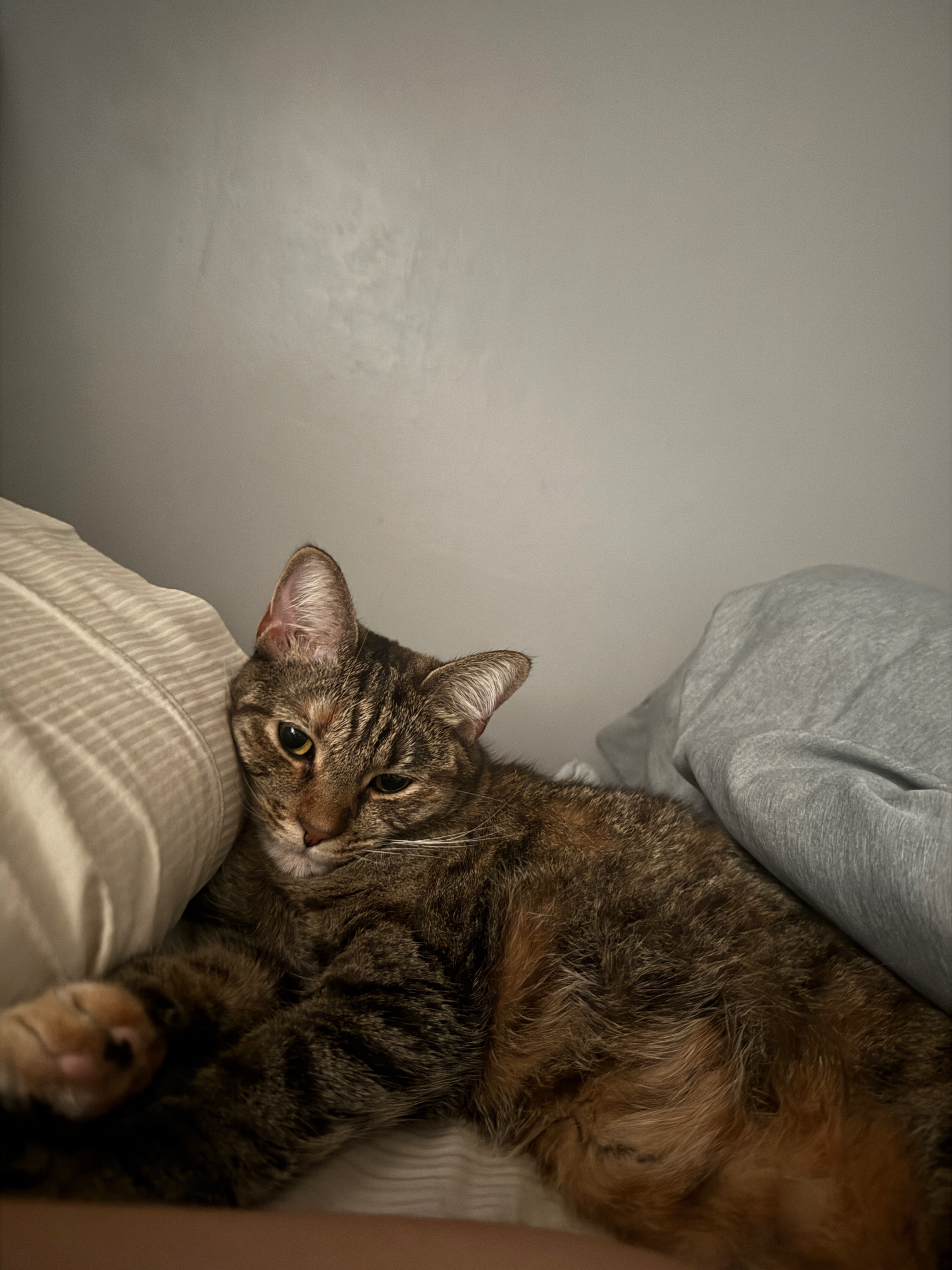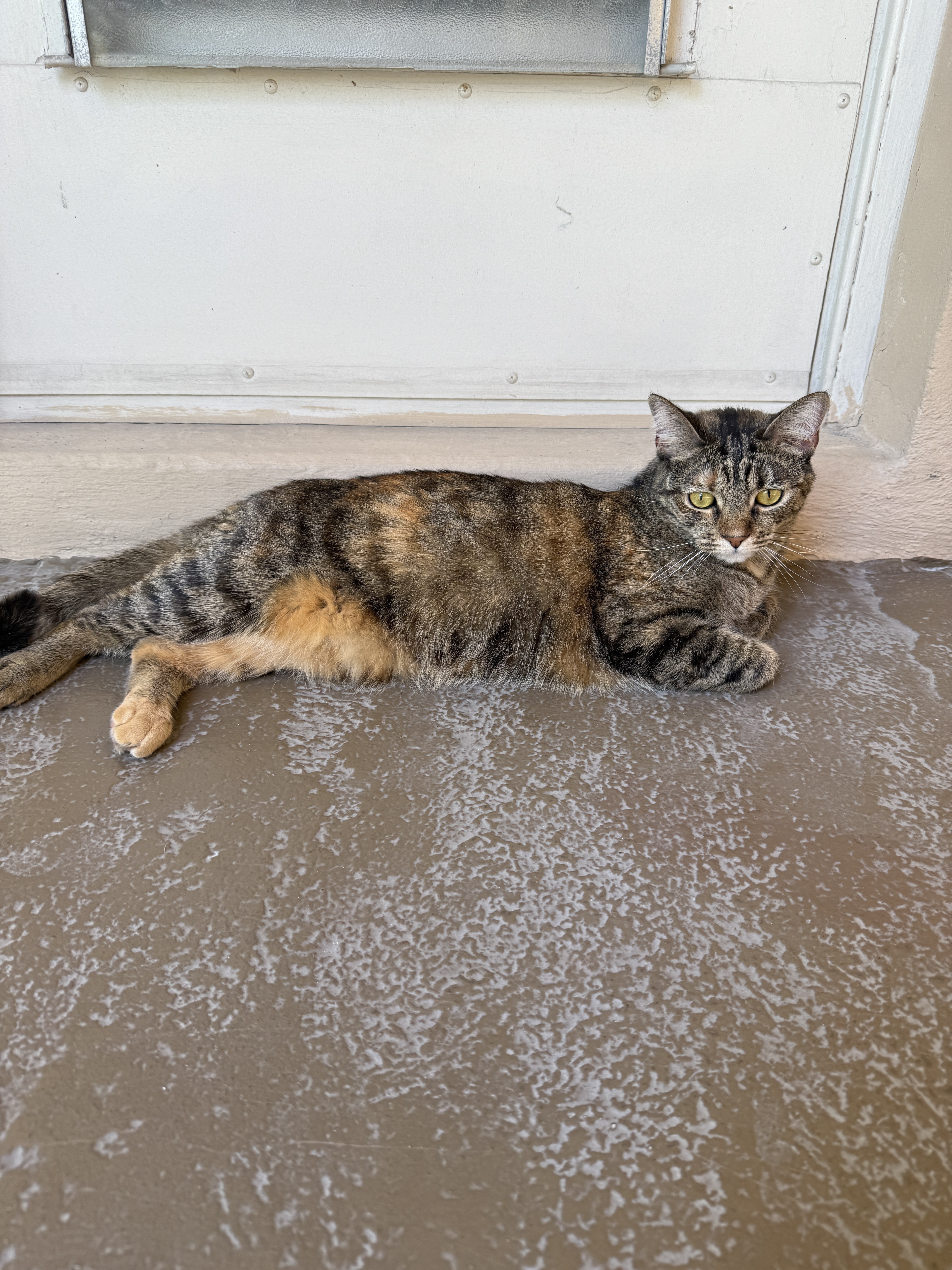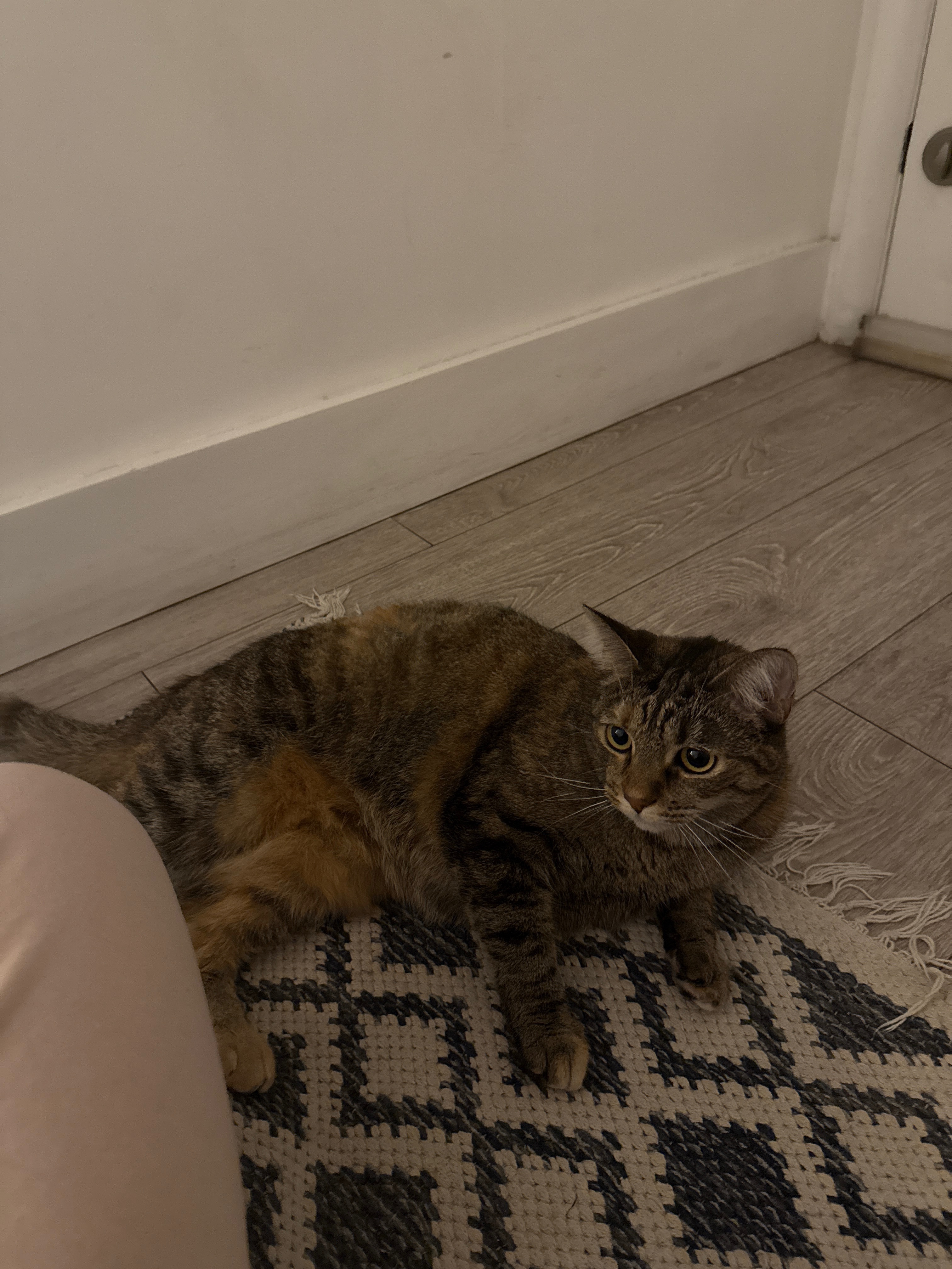 Female cat with yellow eyes, tabby fur with orange/golden tones, and long hair missing. She has longer hair than most tabby cats. She has a white circle of fur around her nose and mouth. Her name is Mila. Please help us find her. One of the bottom of her front paws is pink and the other one black.