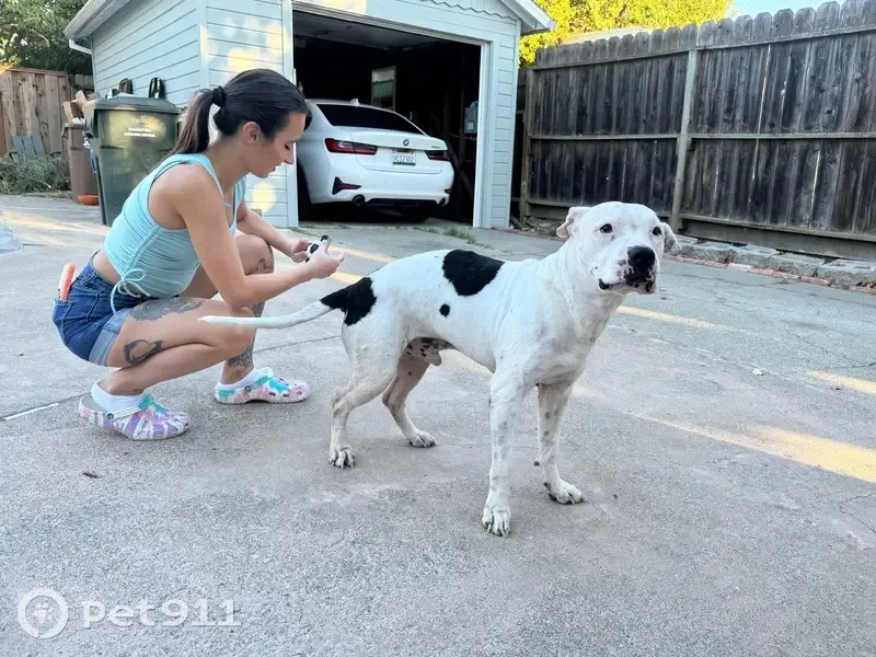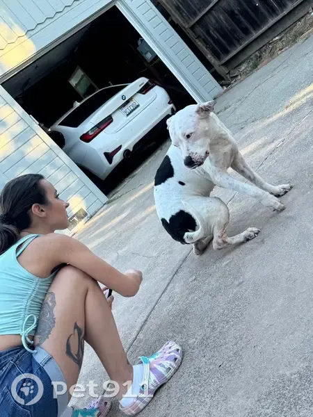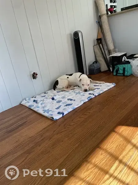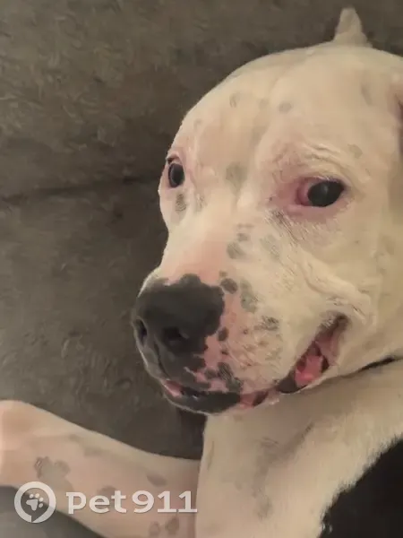 White pit bull with brindle spots and he is deaf. He is also old and may be walking with a limp. He can be skiddish around new people but he is a big softie baby and wouldn’t hurt a fly.