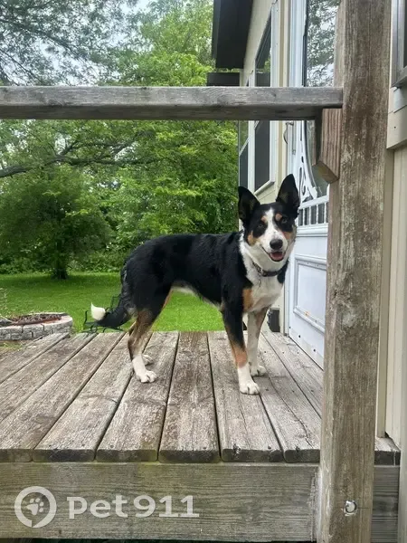 Black, white, and copper tri-color Border Collie mix. 5 years old. About 35 lbs. Pink floral collar with a black plastic clasp. Rose-gold tag with her name on the front and our family info on the back. She was recently spayed so her abdomen is shaved and the fur is starting to grow back in.