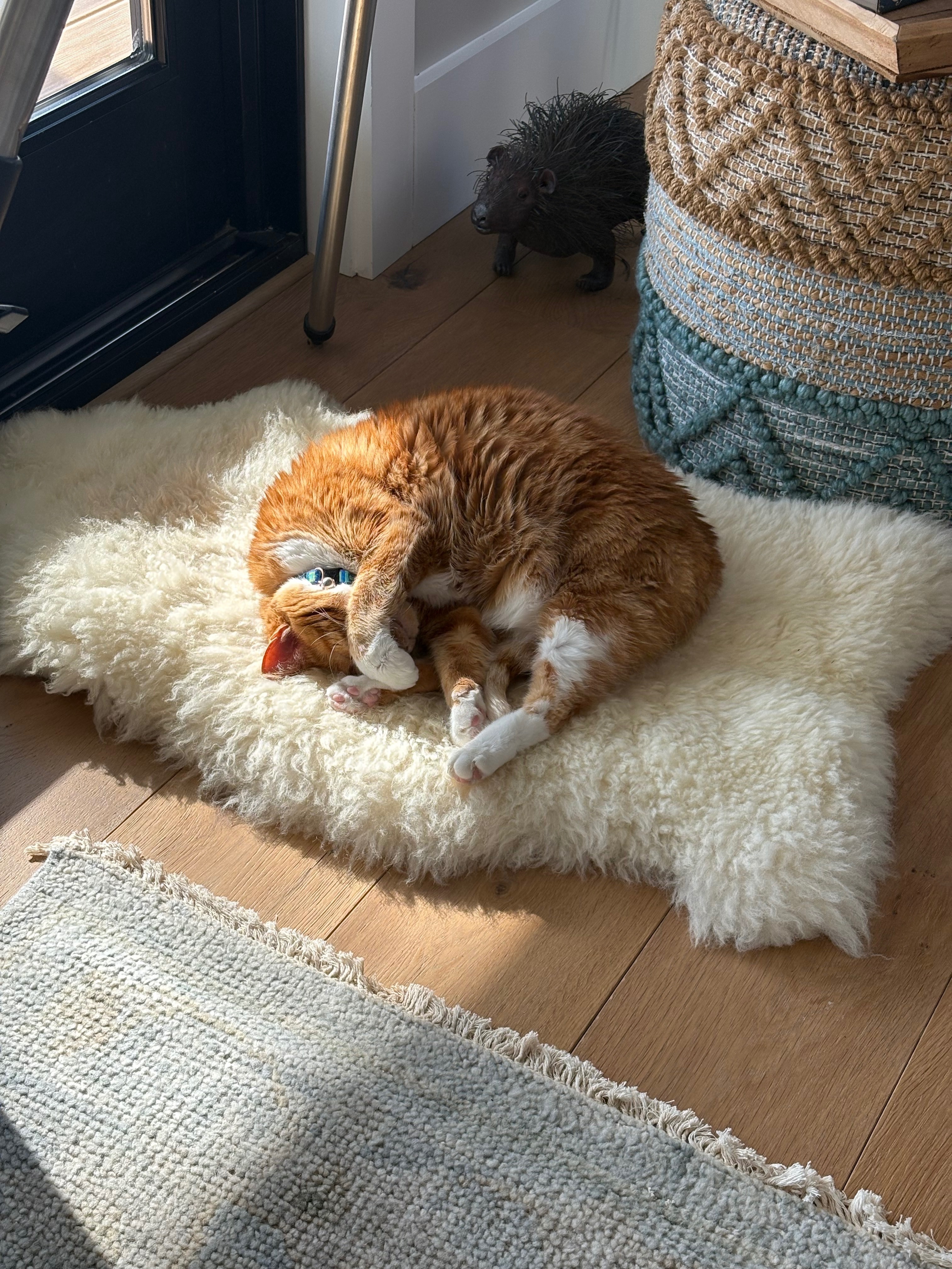 She is a beautiful orange kitty, a little chunky, very friendly and fairly quiet! She has green eyes and a bell on her collar. She is very food motivated, but when she didn’t come down for breakfast we started to look for her. She is able to go outside when she wants, however, she doesn’t normally stay out for too long so at this rate something isn’t right…