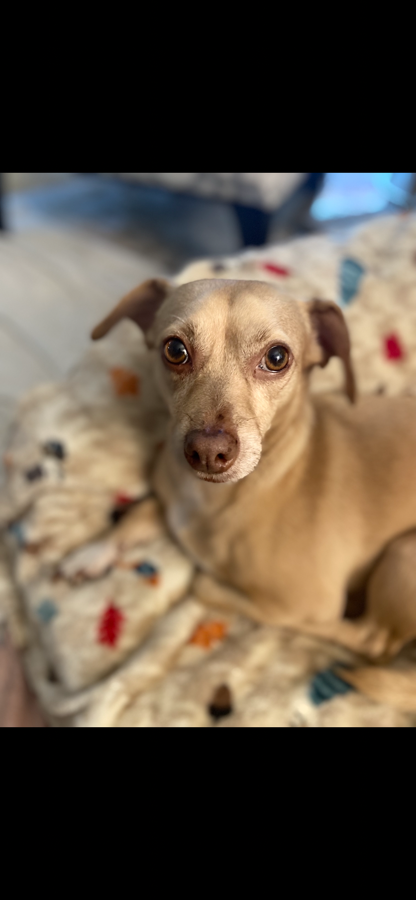 Tan/gold color. Apx 20 lbs, 8-9 yrs old Very skittish, anxious/nerves will run if chased. He is missing several teeth due to gum disease. HE IS MICROCHIPPED. We hired a pet sitter (for the first time ever) and she let him out (against our instruction!!!) without a collar or leash. He was so afraid he ran away. We are devastated and heartbroken. This should have never happened to him!!!!