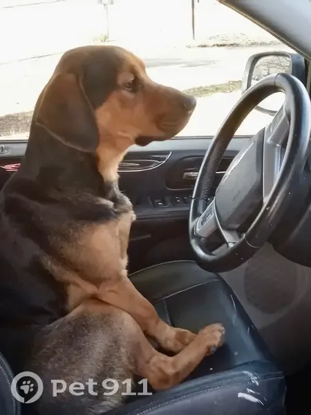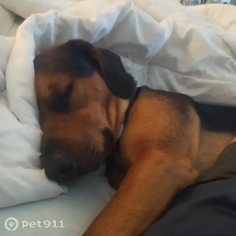 He is mostly black his paws and legs r brown he has floppy ears and gets excited if you say want to go see grandma he last had a blue collar with no tags