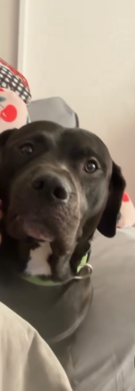 He’s black with a white chest and paws. Amber colored eyes and very skittish but sweet. He’s half Labrador and half pit but on the smaller side about 40-45 lbs long legs