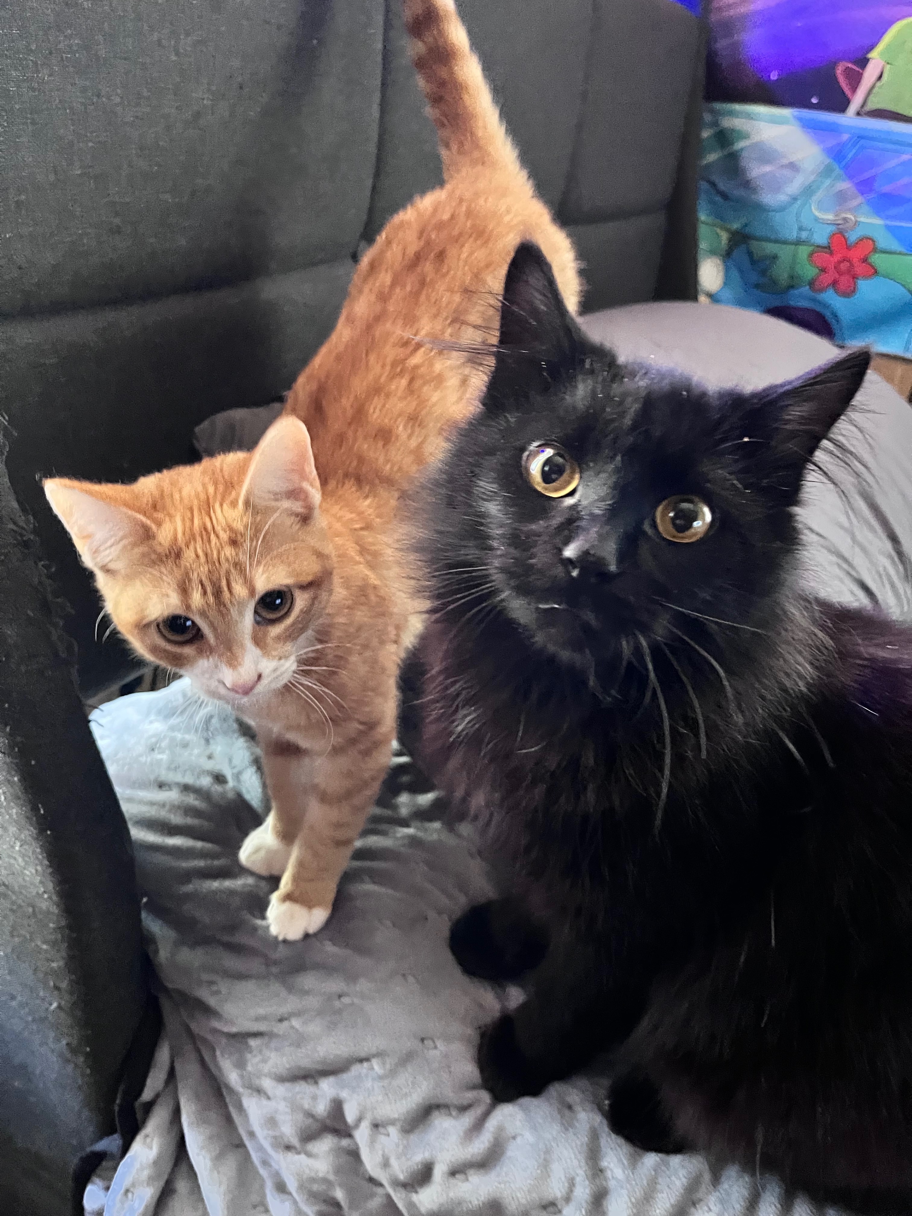 He is a fuffy black cat with little white hairs everywhere on his coat he can be friendly but at the same time he will scratch you if he doesn’t want to be messed with hes pretty big for a cat I rescued him in the woods 2 years ago and I believe he might be mixed with mainecoon his name is Lunar (Loo-ner) he likes the smell of friskies hell go crazy for it he got out of the door after a bath and hasnt been back since.
