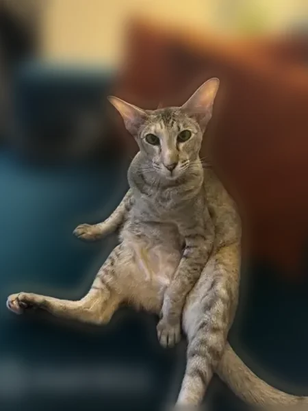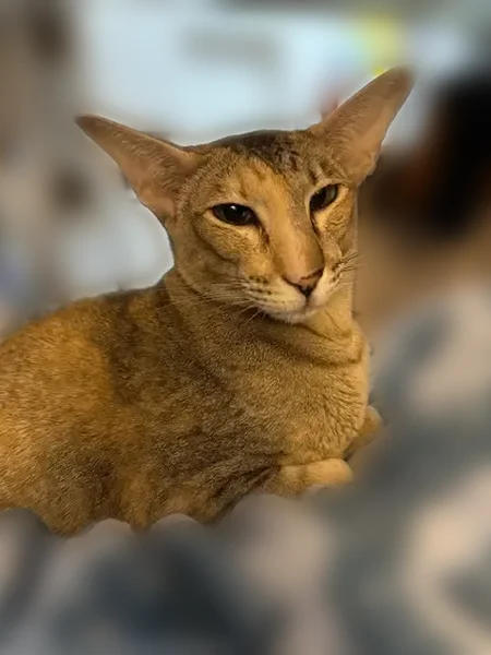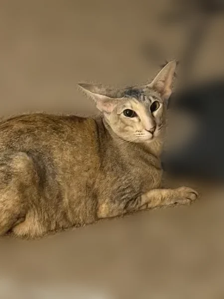 Oriental Shorthair. Long face. Tan and grey tabby. Long tail.