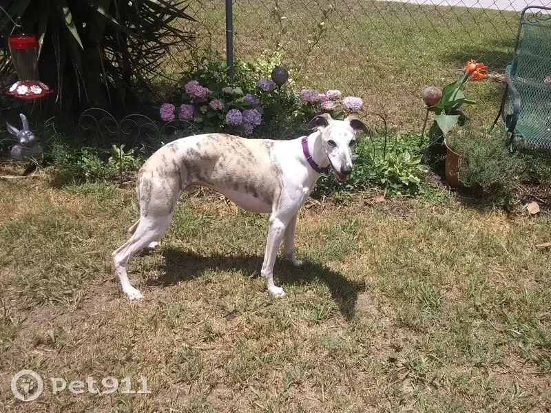 White with brindle spots Whippet. He has a purple martingale collar with my phone number on it. He is a nice dog and might come to you if called .. Named Jazz. We are so worried