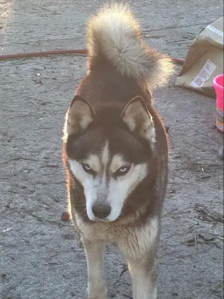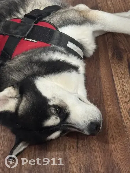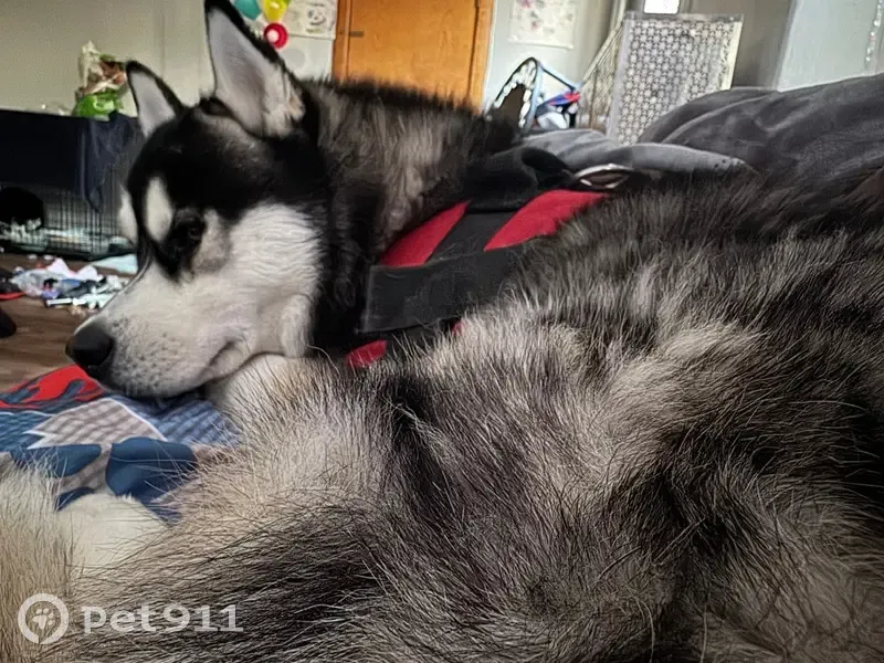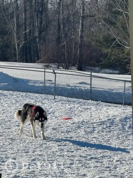 Medium size; Siberian Husky. Black forehead with white eyebrows. Dark grey/grey/light grey/white coloring. Intact but retained testicles. Right eye is pale blue with a streak of brown at the bottom. Left eye is dark brown. Went missing with red harness. Might be with his brother a reddish brown and white Siberian.