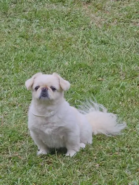 Well kept, freshly groomed Pekingese male. Very friendly animal with white fur and a pink, untagged collar. Began following children home from the school bus.