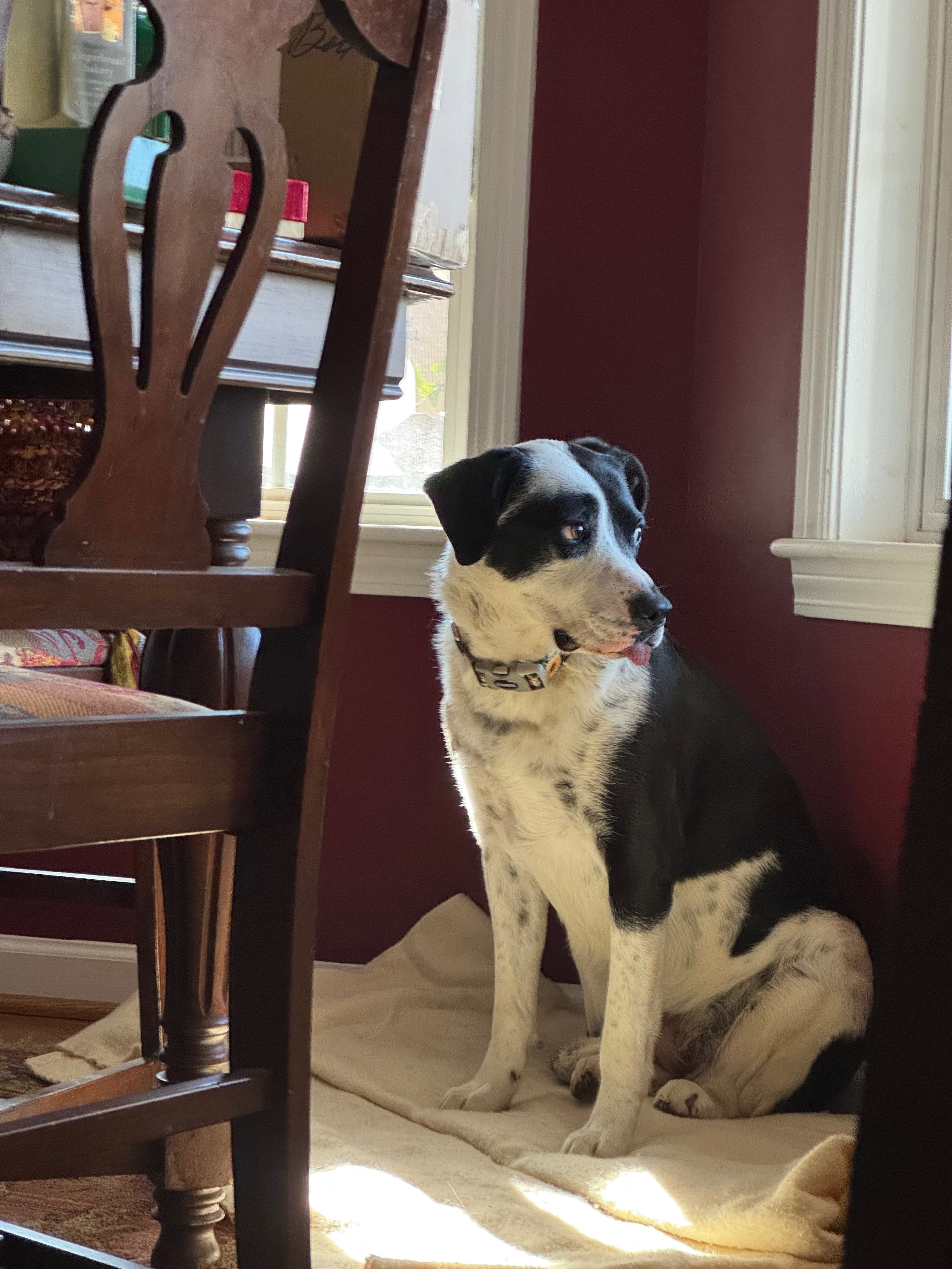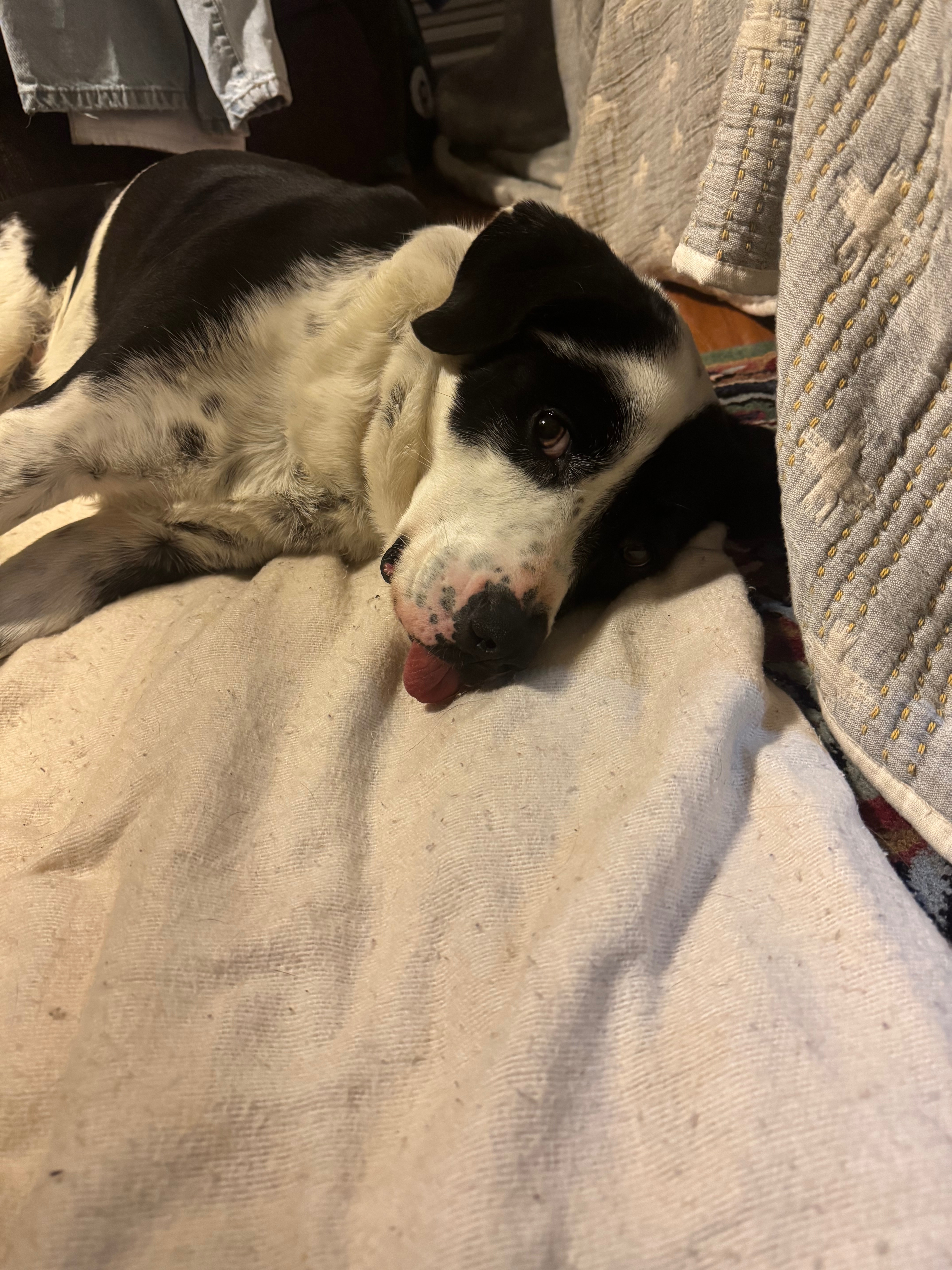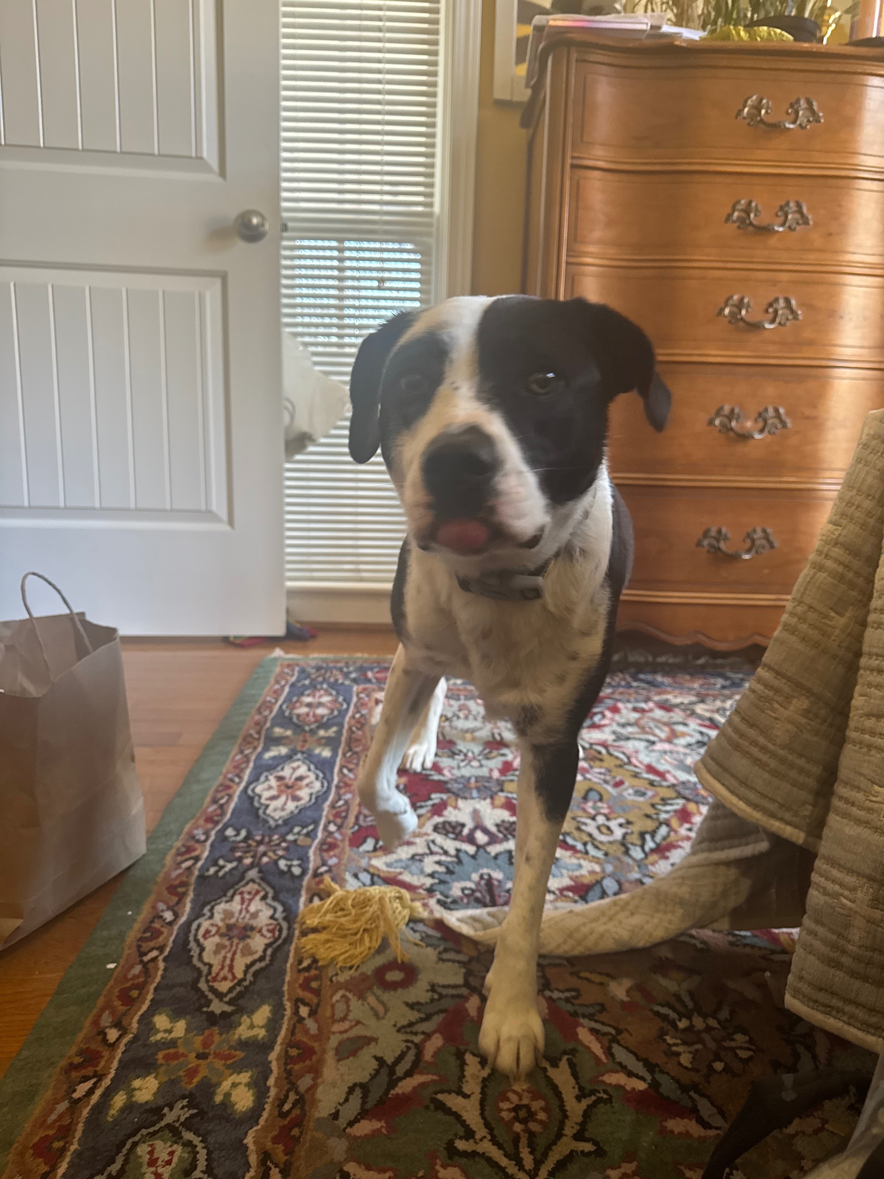 Black and white mixed breed dog, large, pink harness on with retractable leash attached, black collar with flowers on. Very skittish and shy. Loves peanut butter and cheese cubes. Do not approach head on but from side. Not aggressive but may bark at you because she’s scared.