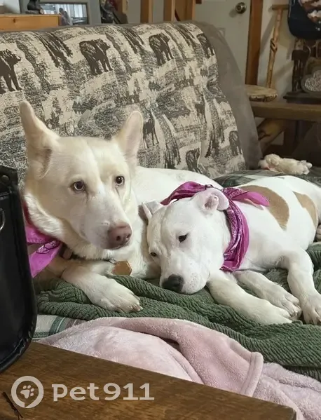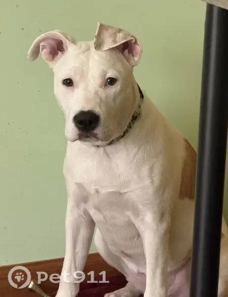 She’s a 7 month old pitbull/staffy mix. Shes all white with light brown spots, she has a light brown spot on her butt that looks like a giant 3 leaf clover. She also has what looks like black dots or spots on the pads of her paws.