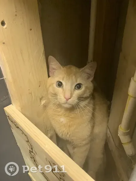 Orange tabby with a white patch on his chest he has a tear stain on his left eye right now. We have recently moved which makes me think he’s gotten lost.