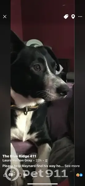Black and white tuxedo short haired border collie. Right ear stands up usually he has white socks, 4 white paws and a white tip on his tail! About 2 feet tall and 50-60 pounds He was seen off Weaver Creek Rd. His brother who escaped with him was found at the Mineral Springs Day Center! Maynard lives kids and elderly people! He belongs to a disabled man who misses him dearly! Emotional support dog!! Please text if found! Or leave a message! Pets name is Maynard!