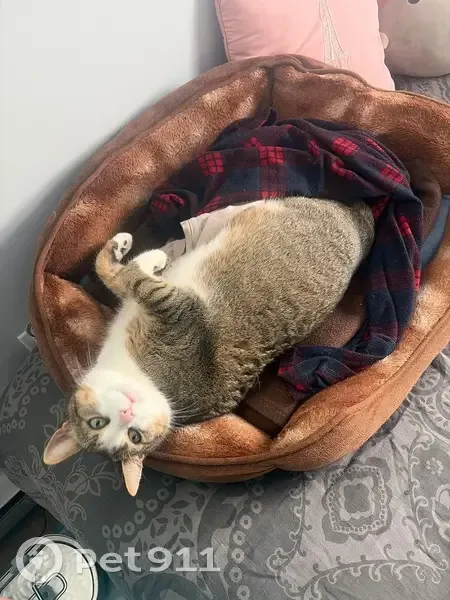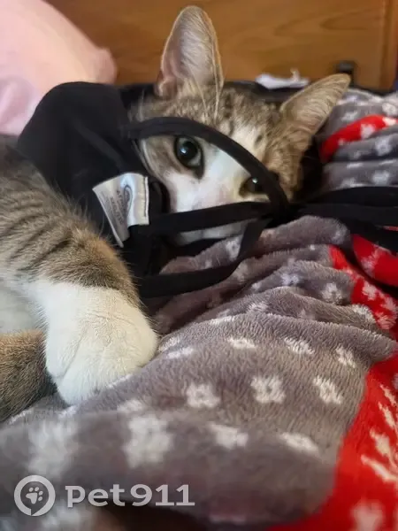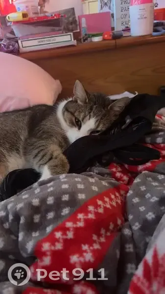 MISSING CAT – DRACO Please help us bring our baby home Draco is 4 years old, neutered, and very loved. He is a brown/gray tabby with a white chest, white paws, white belly, and a white stripe down his nose with a pink nose and green eyes.
