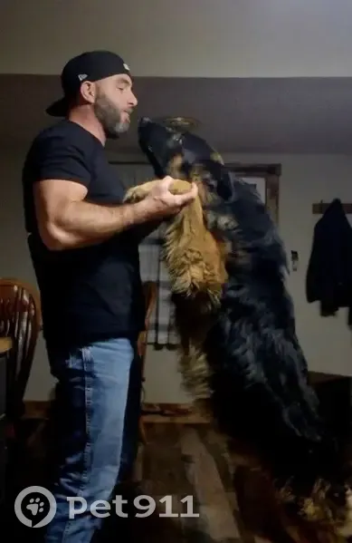 Long Hair German Shepherd, Male, Black Spot on tongue, primarily black face with some tan, 100 pounds, friendly but nervous when away from owner and other family dog