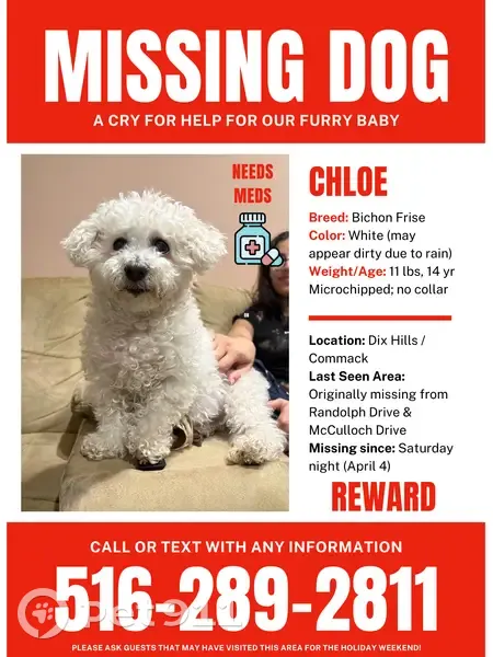 Name: Chloe 13 years old Small (about 11 pounds) White fur (may appear dirty due to rain) Dark brown/black eyes Notable features: Lump on her chest (can be felt when touched) Age warts across her body, especially noticeable on her forehead Microchipped ️ VERY IMPORTANT: Chloe is on medication and urgently needs her meds