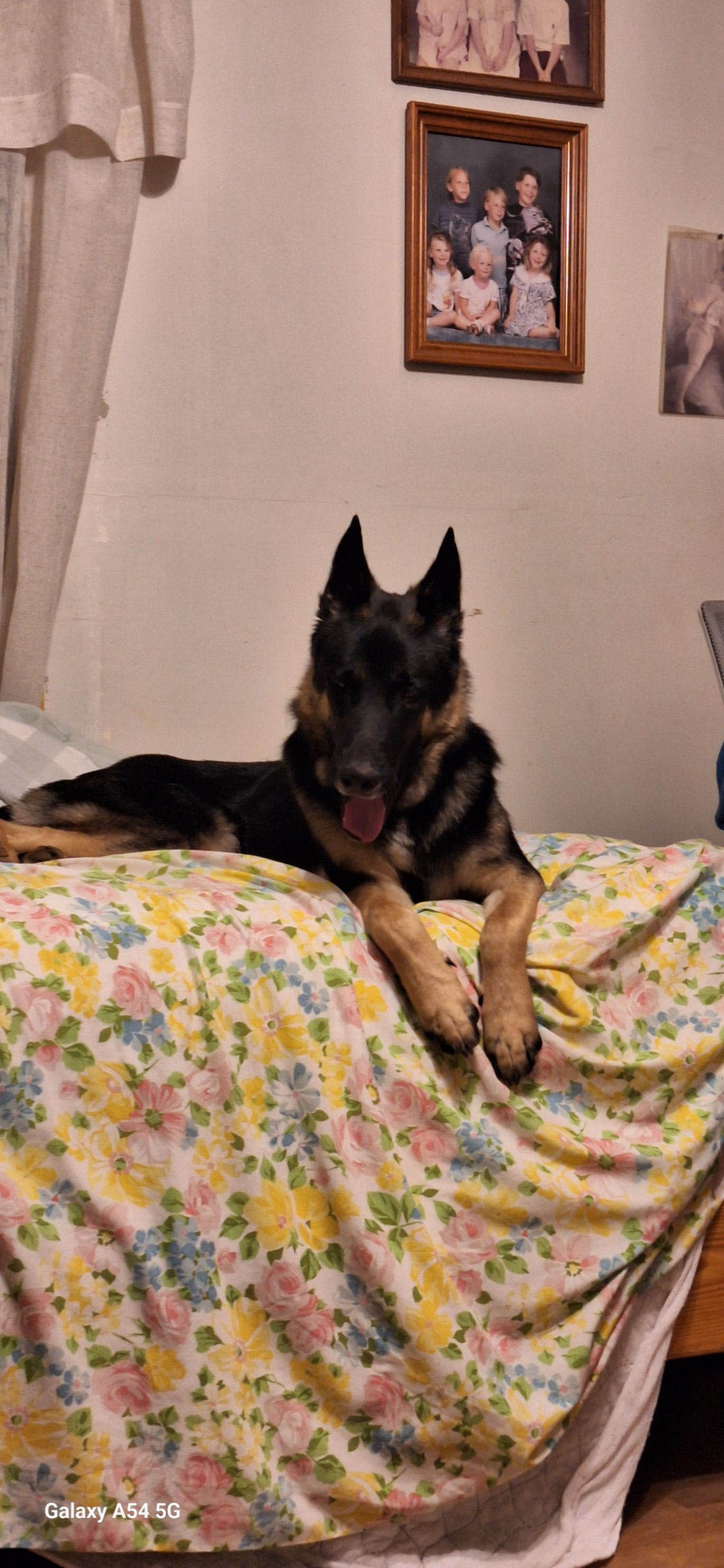 He’s black with tan legs, has a red collar, nuetered and chipped. He’s my support dog and is normally very docile and makes friends easy. I’m here taking care of my parents he doesn’t know the area well and he’s a house dog. Thank you my name is Daphne Marion 434-623-8378