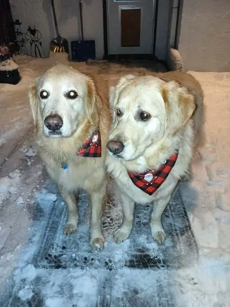 7 year old golden retriever. Face and back are showing some white from age. Around 90 pounds. Friendly but timid around strangers (will probably not come close or run).