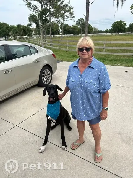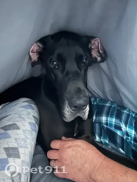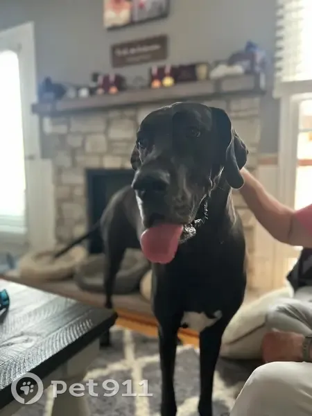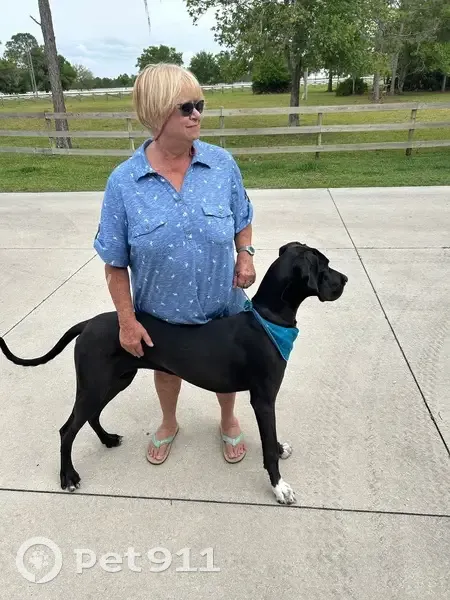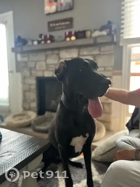 Belle is a 2 1/2 year old Great Dane. She is a black Dane that has white toes upfront like she walked in paint, is tall, and a very sweet dog. She’s a bit shy around men and new people. My mom lost her in Panther Ridge at the park. She broke her collar and ran off.