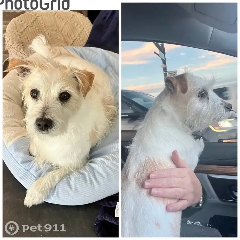 He has white wiry hair with tan ears and tan...